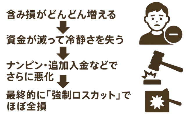 高レバレッジで無謀な取引をしたり、損失を取り返そうとしてギャンブル的な行動に走ることで、一気に資金を失ってしまいます。