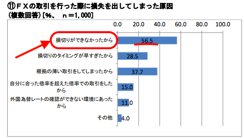 2018年4月に金融先物取引業協会が、FXの取引を行った際に損失を出してしまった原因について調査を行ったところ、「損切りができなかったから」という回答が56.5%でした。